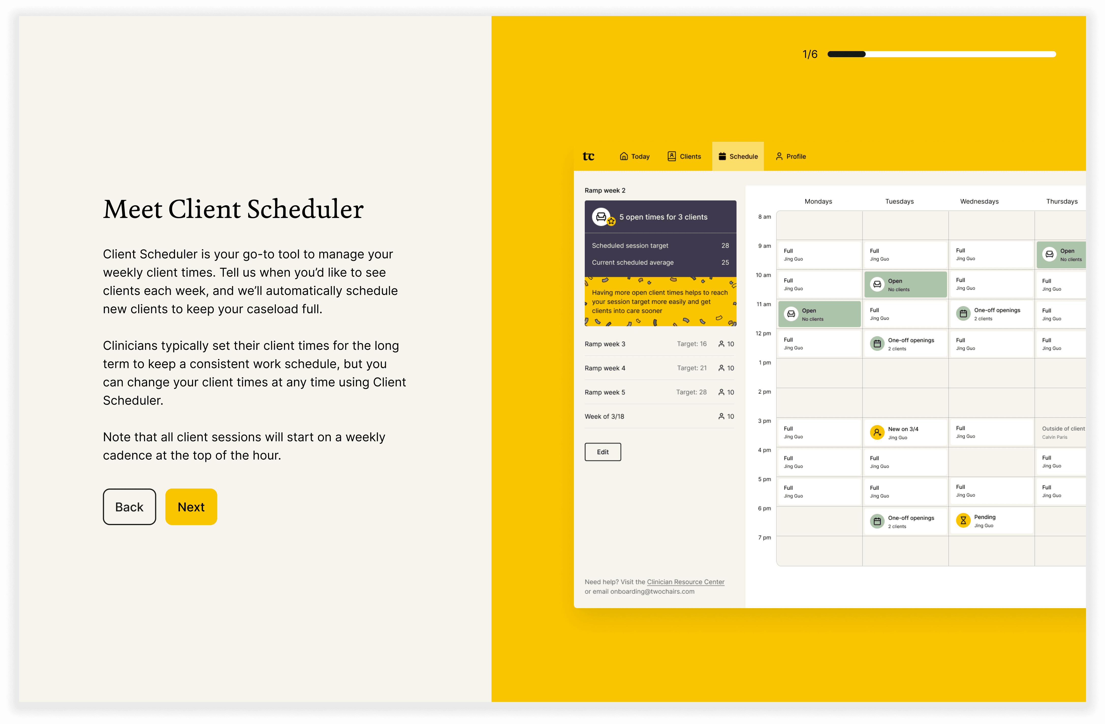 Two Chairs built one of the highest-quality therapy practices in the country and is now focused on expanding access so more people can receive care. With demand far exceeding supply, the biggest opportunity was increasing clinician availability. Beyond hiring, our product team focused on optimizing how clinicians managed their availability—and rebuilding the Client Scheduler was the key project that unlocked this phase of growth.