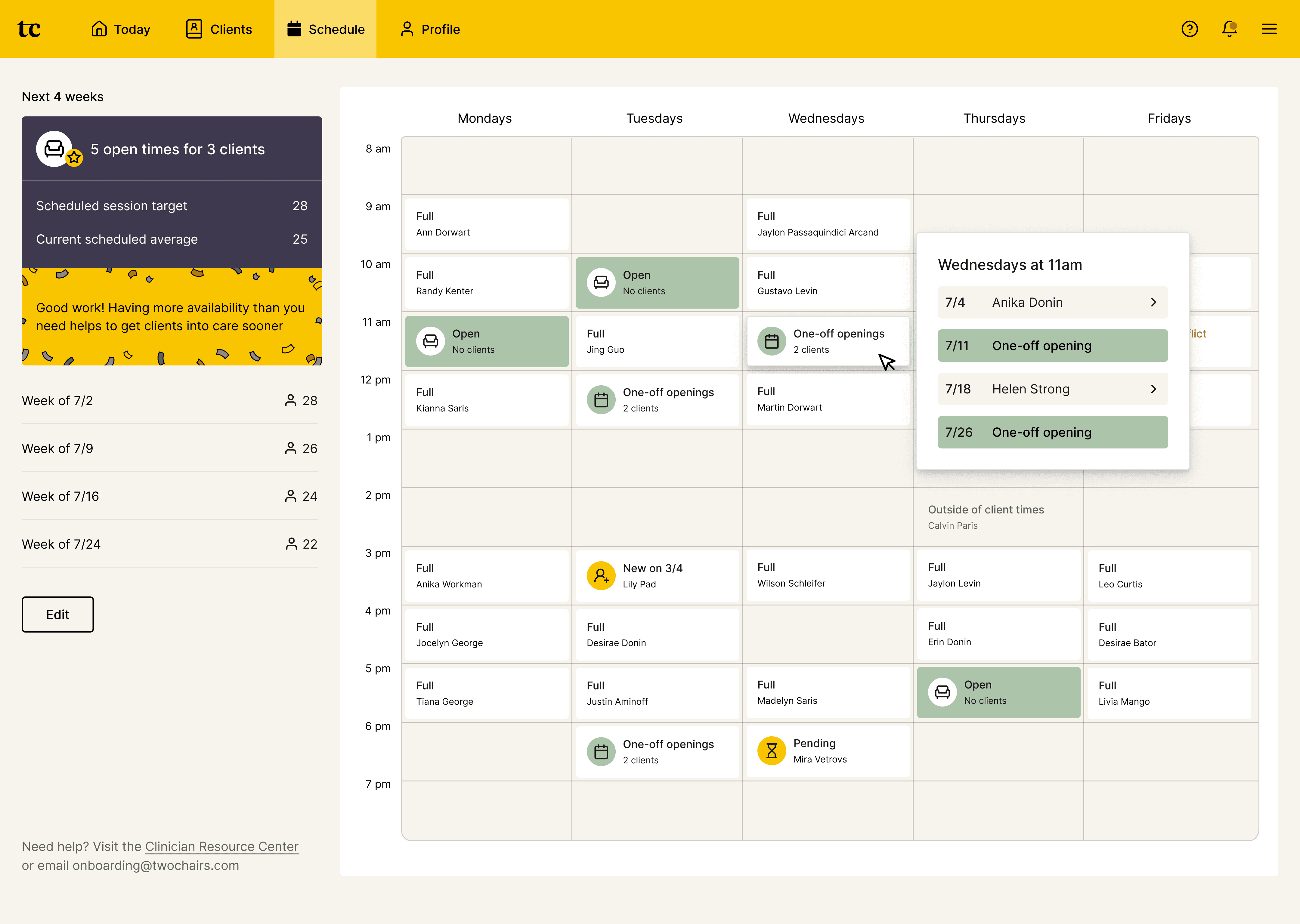 Easy to manage single source-of-truth - Client Scheduler is now the only place clinicians can change their long-term recurring availability, giving them complete transparency and control of their client schedules.