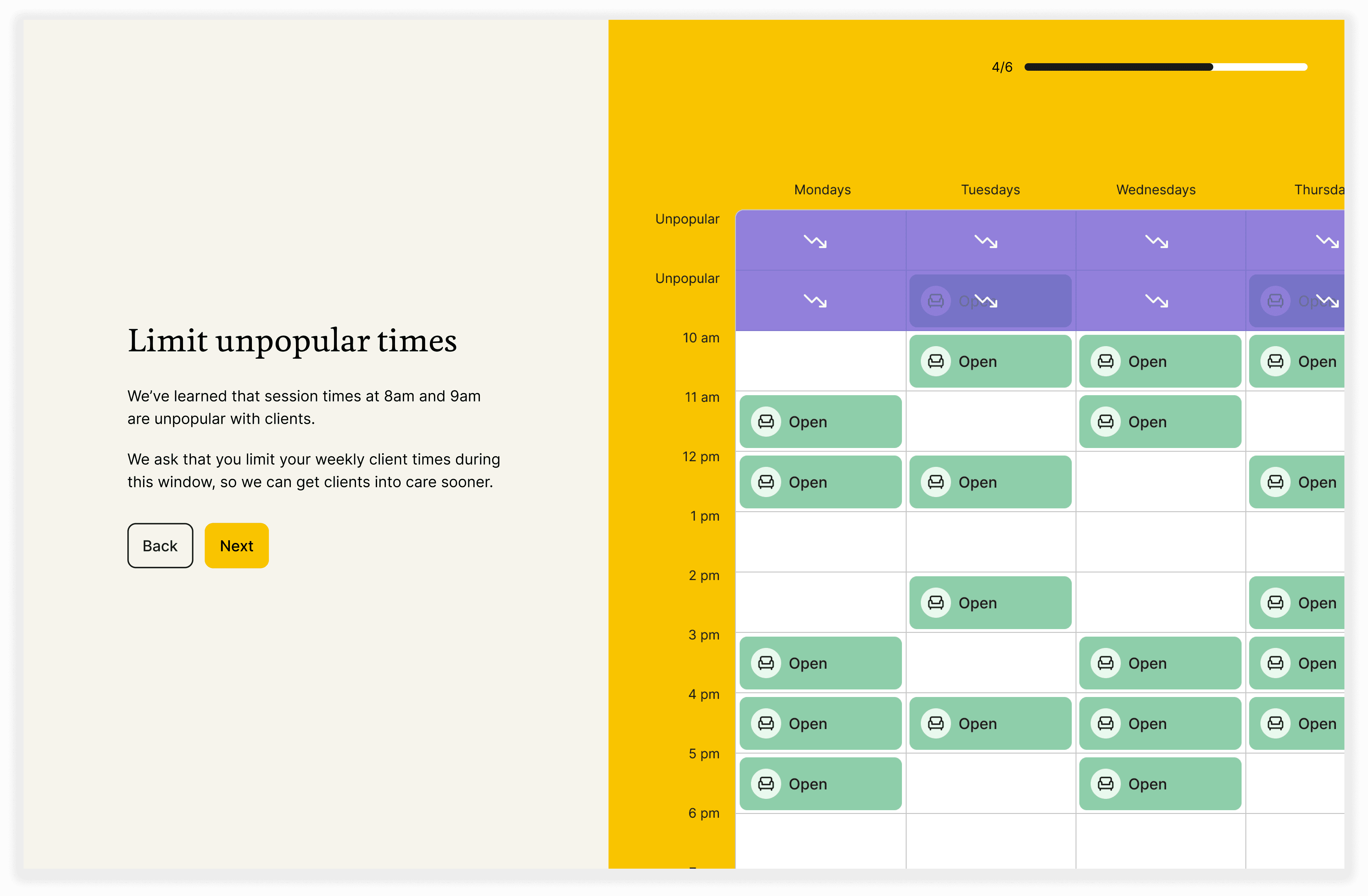 Unpopular times guidance - To balance supply and demand, we introduced a policy through the client scheduler that encourages clinicians to limit availability during unpopular times. Isolating this information in edit mode to simplify the UI and give context only when needed.